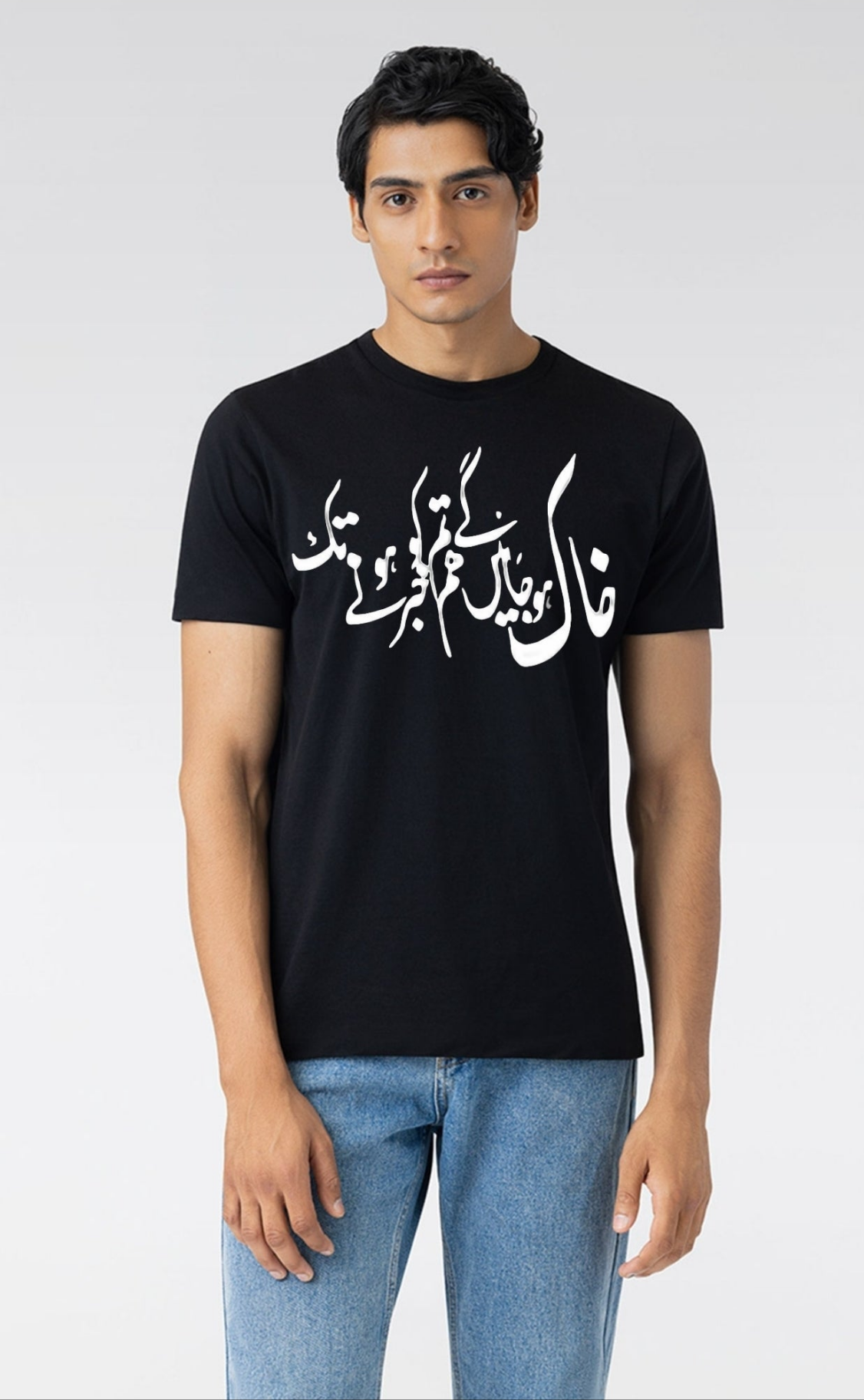 A bold black tee inspired by the haunting beauty of the Urdu line "Khak ho jayenge hum, tum ko khabar hone tak" — meaning: